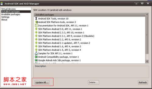 左邊列出來的這些,就是安卓的各個系統版本的模擬程序,我這里因為已經下載了很多,所以有很多。你那里沒有的話那么多,或者沒有你想要的版本的話,請點擊【update all】按鈕,來進行升級。