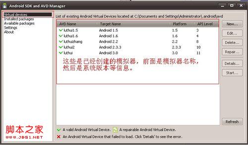 回到【installed packages】標簽,可以查看到你安裝了哪些版本,比如我這里安裝了1.5,1.6,2.1,2.2,2.3.1,2.3.3,3.0版本,除了3.0版本是模擬的安卓平板電腦系統之外,其他的較低的版本都是模擬的安卓手機系統。