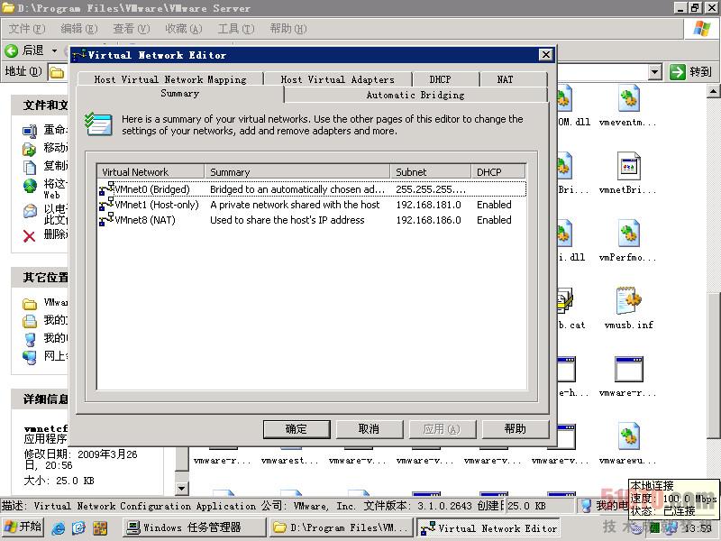中間下面是網絡,顯示的是VMware的三種網絡模式,橋接、僅主機和NAT。可以在開始菜單中找到manage VMware networks管理網絡。