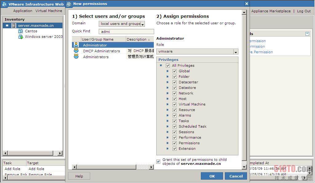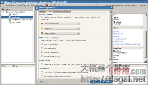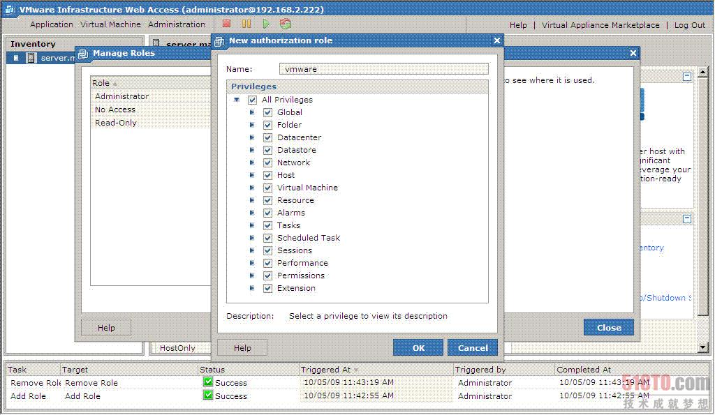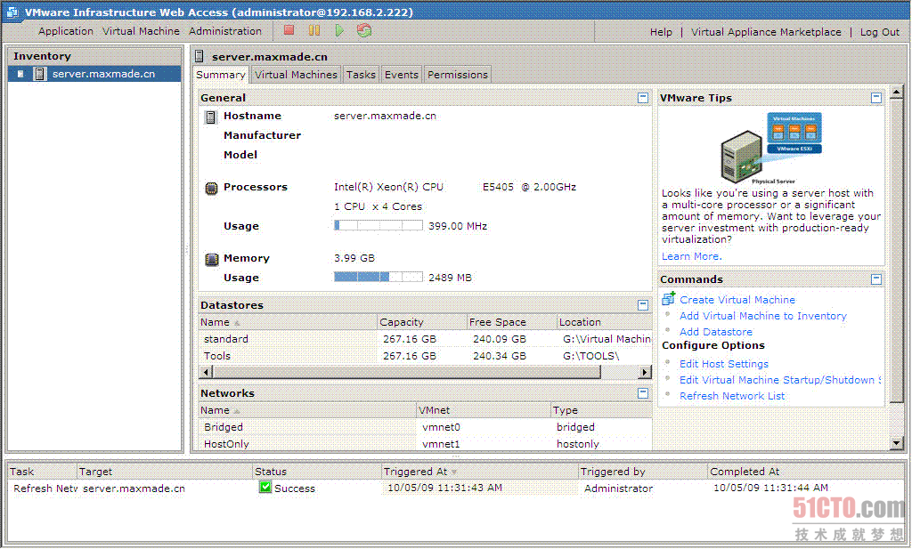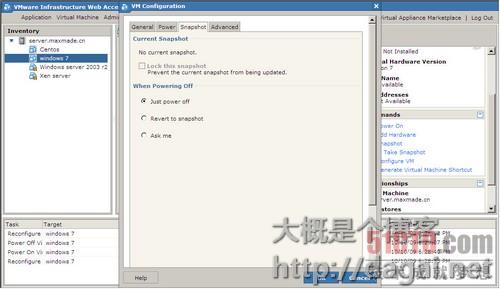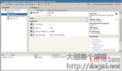 第三個任務,任何一個對VMware server的操作都是一個任務,都會在這里顯示進度,進度100%就完成了。