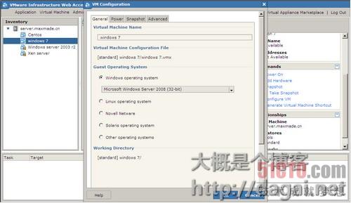 概要里顯示了當前虛擬機的配置信息,需要注意的是這里有個Datastores,怎么翻譯呢?數據倉庫?在virutal server對應的功能應該是"搜索路徑"吧,但VMware server里的datastores很顯然跟virtual server的搜索路徑不一樣,比如指定一個光盤映像,在virtual server中不設置"搜索路徑"可以直接輸入絕對路徑就可以了,而在VMware server不設置datastores使用絕對路徑是無法使用的。這么理解吧,Vritual PC與VMware workstation使用光盤映像可以直接找到光盤位置使用就行了,但VMware server不是,所使用的映像必須是datastores里的,默認datastores里有個叫standard的datastore,至于怎么添加其他的路徑到datastores里稍后再說。