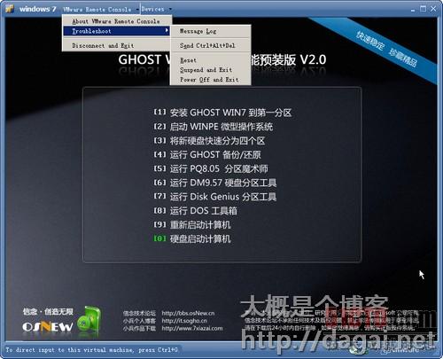 OK,顯示器打開了,上方有兩個菜單,虛擬機遠程控制臺和設備,虛擬機控制臺里可以向主機發送Ctrl+Alt+Del組合按鍵信息,因為Ctrl+Alt+Del組合鍵是被宿主機獨占的,當然,你也可以按Ctrl+Alt+Insert來向虛擬機發送Ctrl+Alt+Del組合鍵信息,另外可以重啟、休眠和關閉虛擬機。