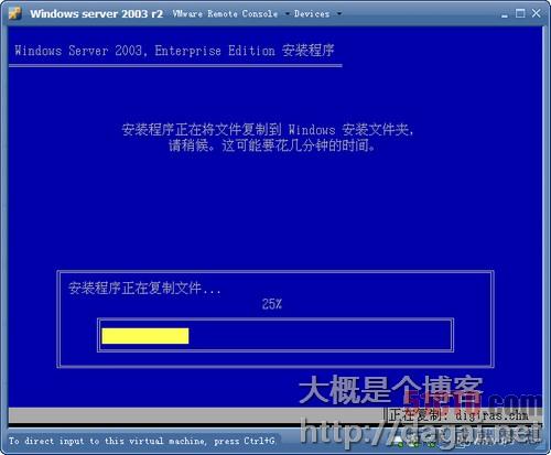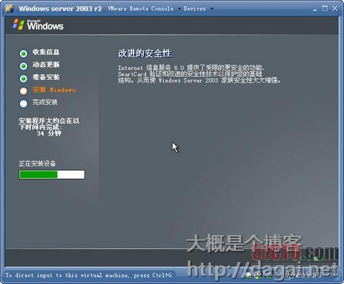 設備菜單呢,還記得之前添加虛擬機硬件的時候,有些硬件有個選項是是否在啟動的時候連接,這里就是控制這些設備連接和斷開的。當然,每次虛擬機重新打開的時候,這些設備的連接狀態還是你在設置虛擬機的時候選擇的狀態。左下角有一句話,這個是提示虛擬機鼠標獨占和釋放獨占的快捷鍵,按Ctrl+G鍵,鼠標就被虛擬機獨占了,這時鼠標只能在虛擬機范圍內使用,如果要釋放鼠標,按Ctrl+Alt鍵就行了,左右的都行,在安裝完系統再安裝了Vmware