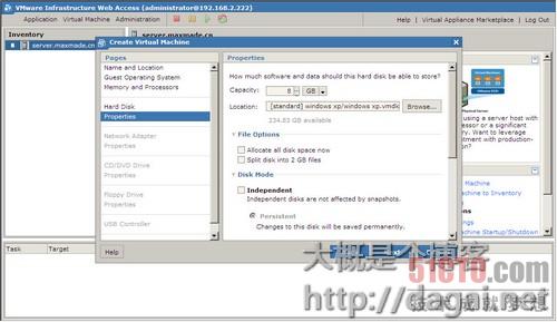 Options(文件選項),因為虛擬硬盤默認是動態的,也就是你創建的虛擬硬盤8GB,但系統不會立刻就創建一個8GB的虛擬文件,而是隨著你的使用慢慢增大,最大到8GB,文件選項里第一個選項就是立刻分配磁盤空間,比如你創建一個虛擬硬盤8GB那么就立刻在主機硬盤里創建一個8GB的虛擬硬盤文件,這個在做群集的時候會提升一定性能。第二個選項是是否把虛擬硬盤文件分割成2GB一個的文件,這個選項不影響你虛擬機的使用,但跟主機有點關系,因為如果主機存放虛擬機虛擬硬盤的分區是FAT32格式,FAT32允許的最大單個文件大小是2GB,所以當如果你虛擬硬盤是動態的時候,你明明分的是8GB,但到2GB的時候你就會發現你虛擬機提示硬盤空間不夠了,要注意哦,這里的這個文件分割成2GB大小就是針對這個來的,如果是主機磁盤是NTFS格式那就沒所謂了。