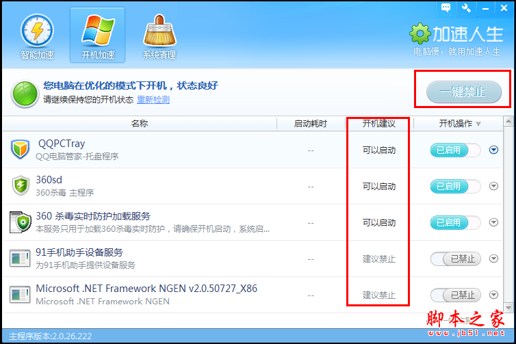 “開(kāi)機(jī)加速”這個(gè)功能主要是針對(duì)開(kāi)機(jī)速度進(jìn)行優(yōu)化的。用戶可根據(jù)“開(kāi)機(jī)建議”對(duì)可禁用應(yīng)用進(jìn)行選擇,以關(guān)掉不需要的應(yīng)用加快開(kāi)機(jī)速度。