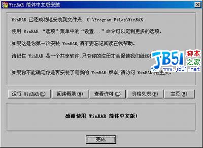 圖2 設(shè)置關(guān)聯(lián)等 圖2 中分三個(gè)部分,您在左邊的“WinRAR關(guān)聯(lián)文件”是讓您將下面的格式的文件創(chuàng)建聯(lián)系,如果您決定經(jīng)常使用 WinRAR 的話,可以與所有格式的文件創(chuàng)建聯(lián)系。如果您是偶然使用 WinRAR 的話,也可以酌情選擇。右邊的“界面”是選擇 WinRAR 在 windows 中的位置。“外殼整合設(shè)置”是在右鍵菜單等處創(chuàng)建快捷。都做好選擇后,點(diǎn)“確定”就會(huì)出現(xiàn)圖3,點(diǎn)擊“完成”成功安裝。