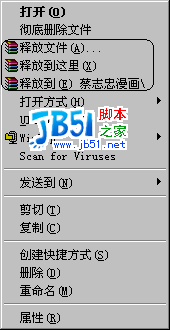 當(dāng)您在壓縮文件上點(diǎn)右鍵后,會(huì)有圖6中畫圈的選項(xiàng)出現(xiàn),您選擇“釋放文件”