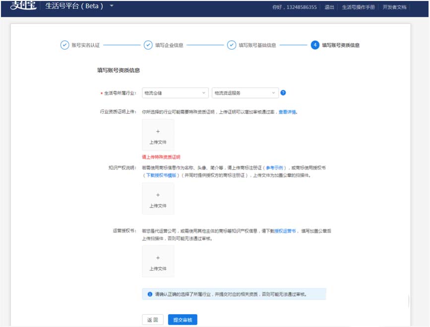 3、若賬號已認證,則出現(xiàn)以下頁面,進入入駐申請流程。根據(jù)頁面的提醒,上傳企業(yè)營業(yè)執(zhí)照及聯(lián)系人信息。