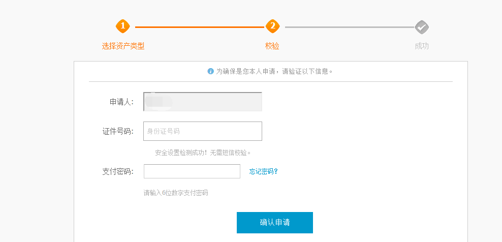 5、輸入身份證號碼和支付密碼(支付密碼關系到您的財產安全,切記不可泄露),點擊確認申請。