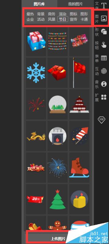3。例如,你想要添加一些照片祝福類的小圖片可以點(diǎn)擊圖片然后按照類型選擇,婚禮是在節(jié)日里找,又或者你要添加本地照片就點(diǎn)擊下方紅框里的上傳照片就可以了,編輯完以后你就可以選擇保存或者發(fā)布分享給想要看的人了~