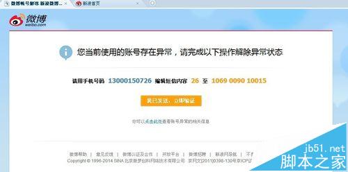5、第二個新浪賬號登陸后,到第一個網頁,點擊下一步,就會提示發短信解凍,也就是新賬號,將新浪凍結發送頁面弄出來了,(多說句,也可以不看,但是這樣發短信,解凍后進入的是你的第二個新浪賬號,所以現在還不能發送短信,這個方法還可以,保存無限個新浪凍結發送頁面。)會出現【我已發送,立即驗證】的鏈接,如下圖。