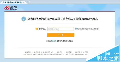 1、電腦進入瀏覽器,用被凍結的賬號,也就是老賬號,進入解凍頁面,輸入手機號,如果提示頻繁,不能進行下一步,試試這個方法:保留這個新浪解凍網頁,也就是第一個網頁,先不用管第一個網頁了,如下圖。