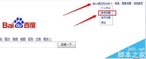 1、首頁,進入到登錄了百度帳號的首頁或者其他百度頁面,鼠標放到右上角帳號那里,可以看到有個下拉列表,選擇“帳號設(shè)置”:
