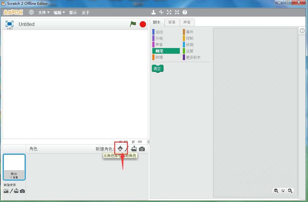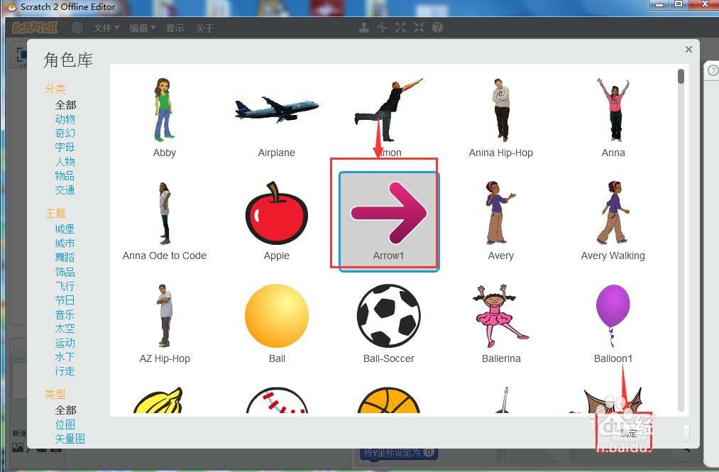 4、進入scratch2.0的角色庫中,找到并點擊箭頭,按確定;