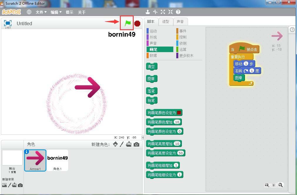 7、點擊綠旗執(zhí)行程序,我們就記錄了箭頭在旋轉過程中的軌跡。