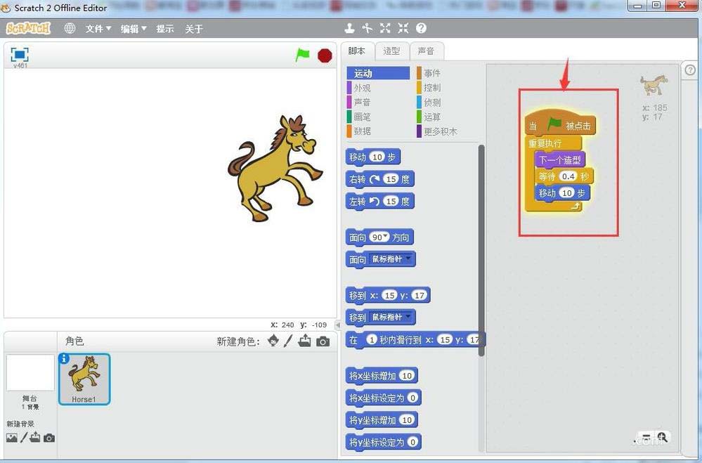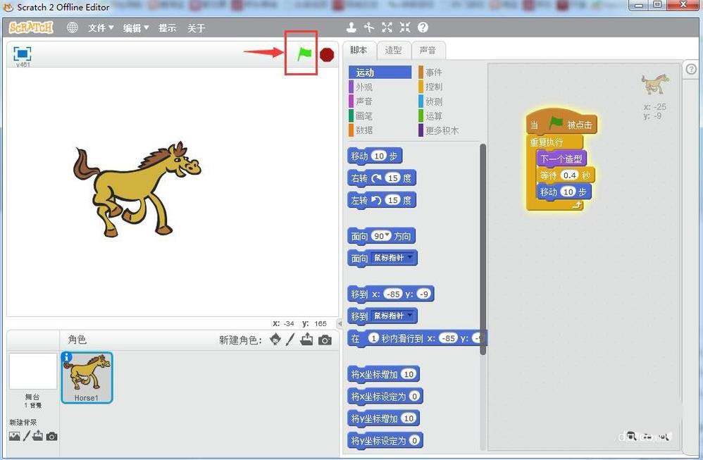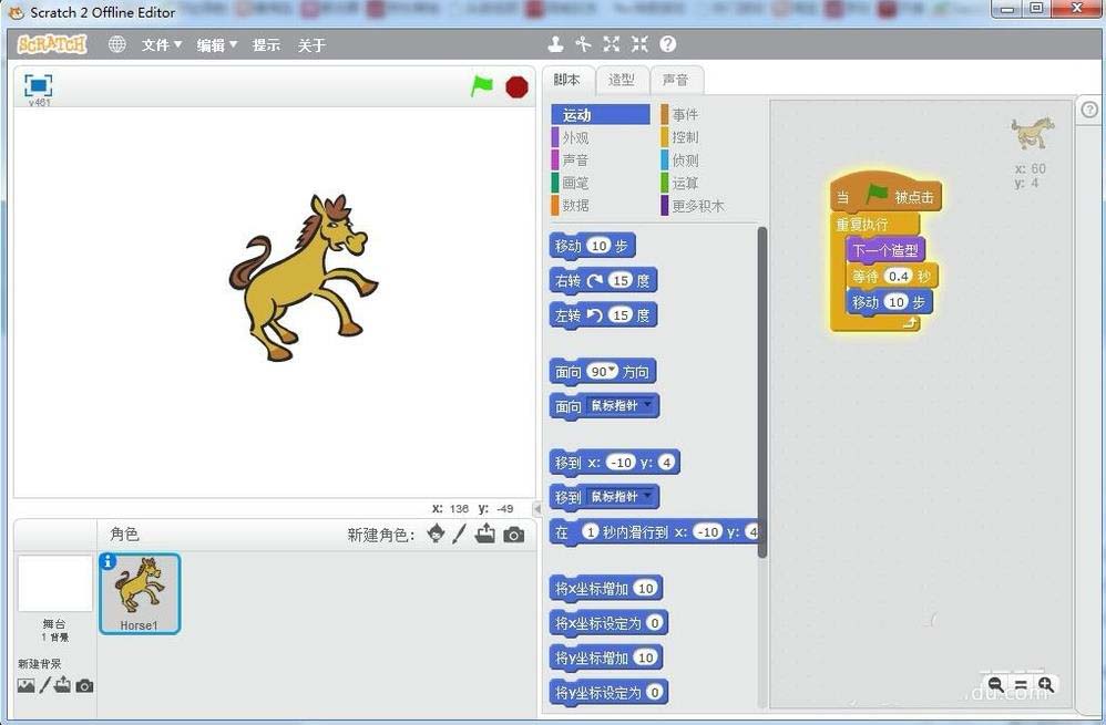 10、駿馬就開始奔跑,一個駿馬奔跑的動畫就在scratch中創建好了。