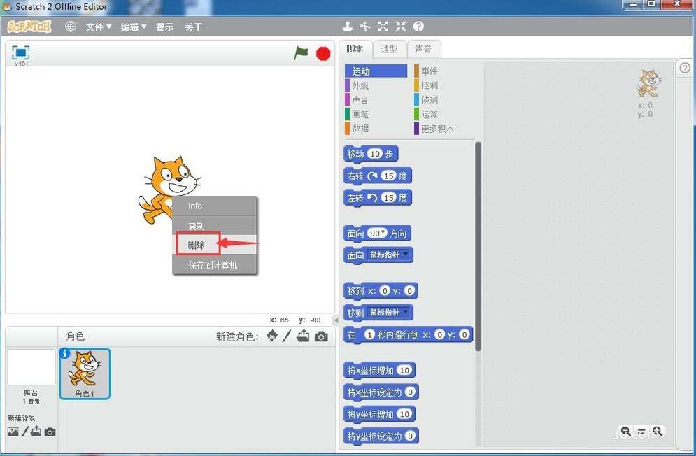 2、在小貓上按右鍵,點擊刪除,將它刪除掉;