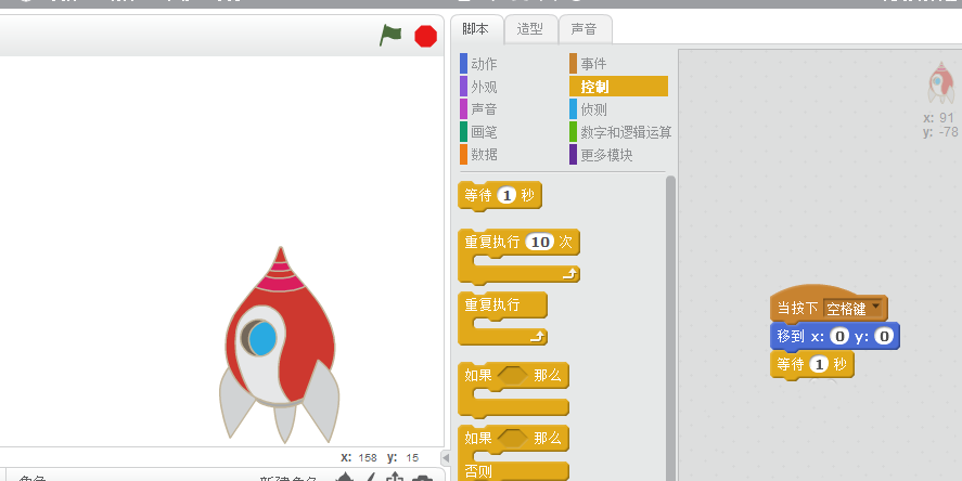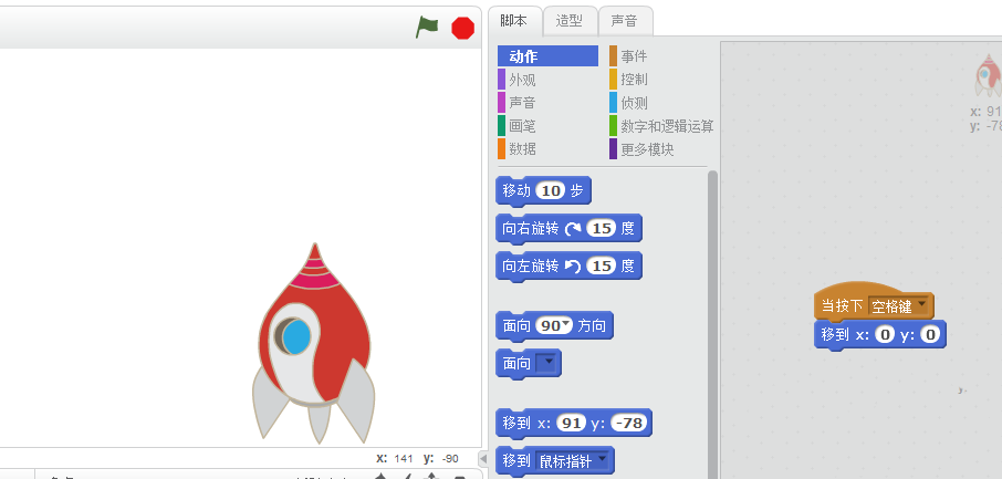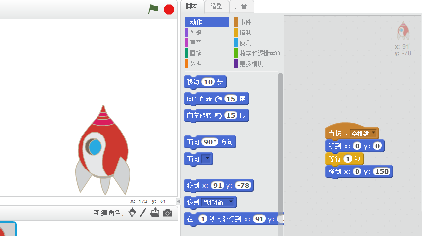 6、點(diǎn)擊“動(dòng)作”——拖“移到X:Y:”至代碼區(qū),參數(shù)設(shè)為X:0,Y:150 。Y參數(shù)越大,火箭飛越高。按空格鍵,測(cè)試效果。