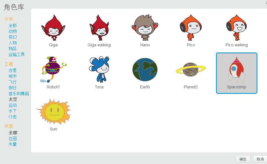 2、從角色庫(kù)中選取火箭角色,別忘了點(diǎn)確定