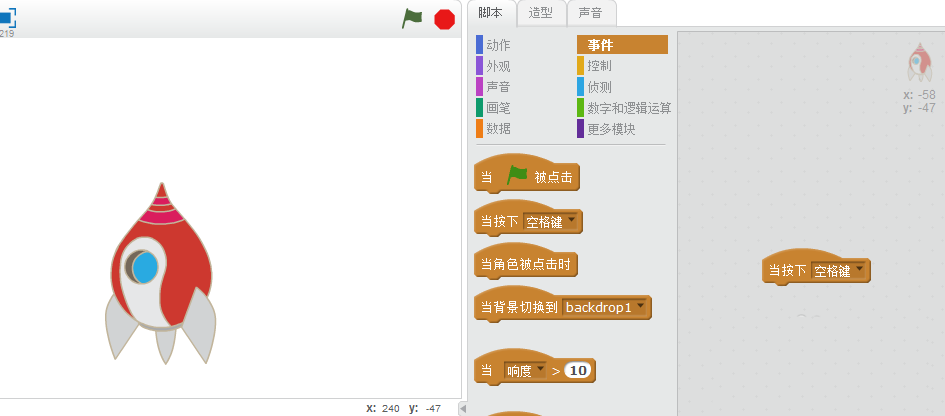 3、點(diǎn)擊“事件”——拖“當(dāng)按下空格鍵”至代碼區(qū)