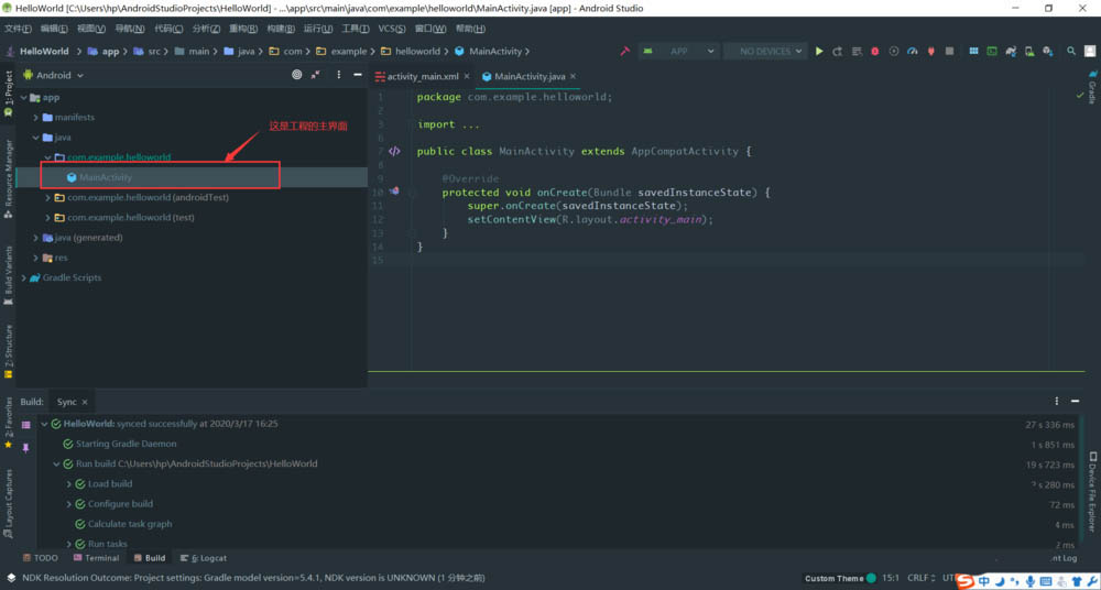 6、打開包名下面的“MainActivity”,就是我們項目的主界面。