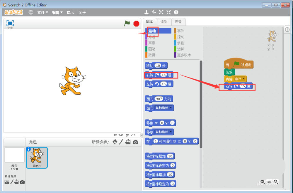 6、點(diǎn)運(yùn)動(dòng),將旋轉(zhuǎn)命令拉到腳本中;