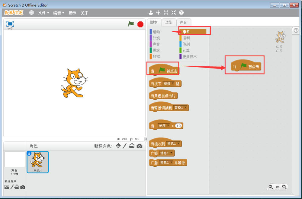 2、點(diǎn)事件,將當(dāng)綠旗被點(diǎn)擊時(shí)拉到右邊的腳本編輯區(qū);