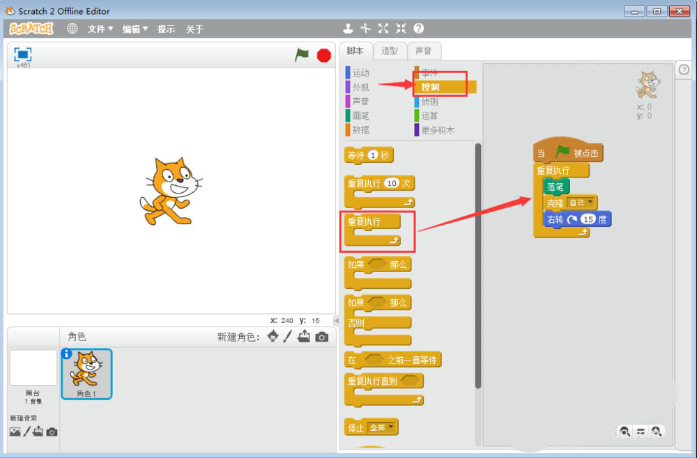 7、點(diǎn)控制,將重復(fù)執(zhí)行拉到腳本編輯區(qū)中;