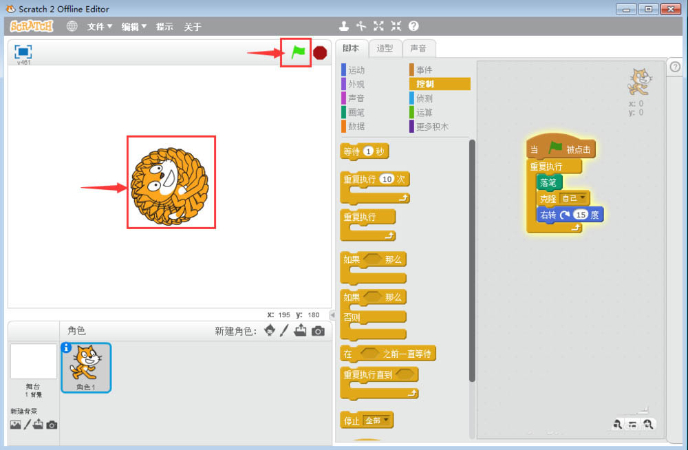 8、點(diǎn)擊綠旗,開始執(zhí)行程序,我們就可以通過克隆功能實(shí)現(xiàn)對象自身的復(fù)制功能。
