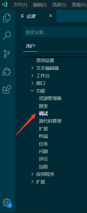4、進入設置后,點擊“功能-調試”。