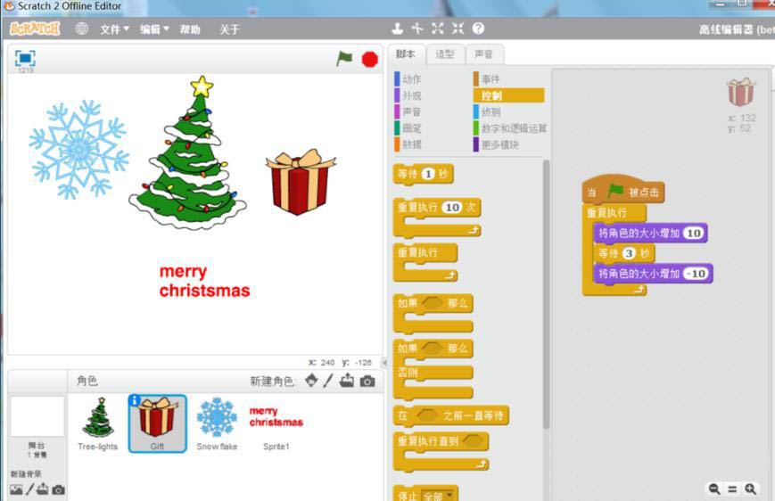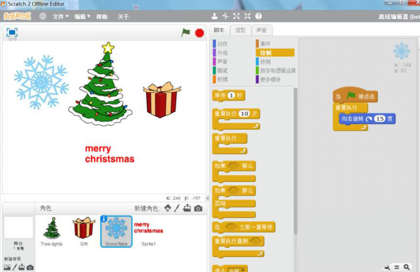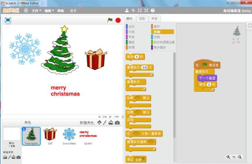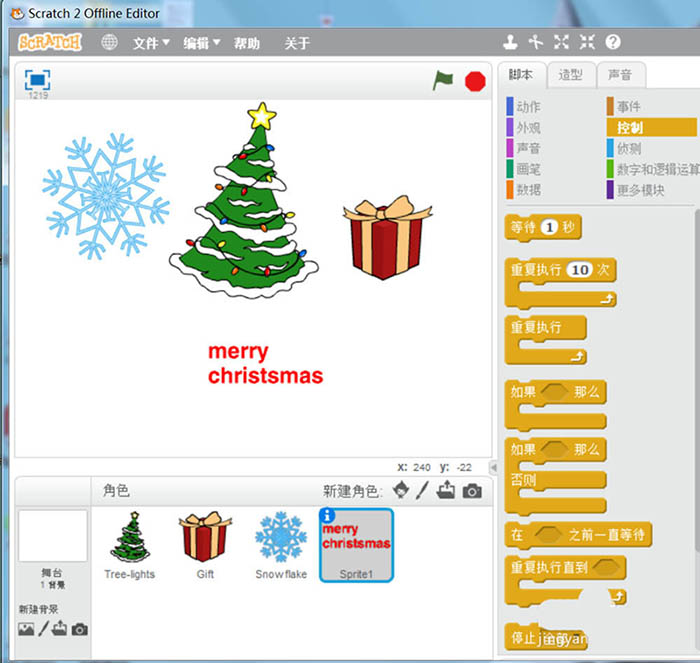 以上就是scratch創(chuàng)建圣誕快樂背景動(dòng)畫的教程,希望大家喜歡,請(qǐng)繼續(xù)關(guān)注武林網(wǎng)。