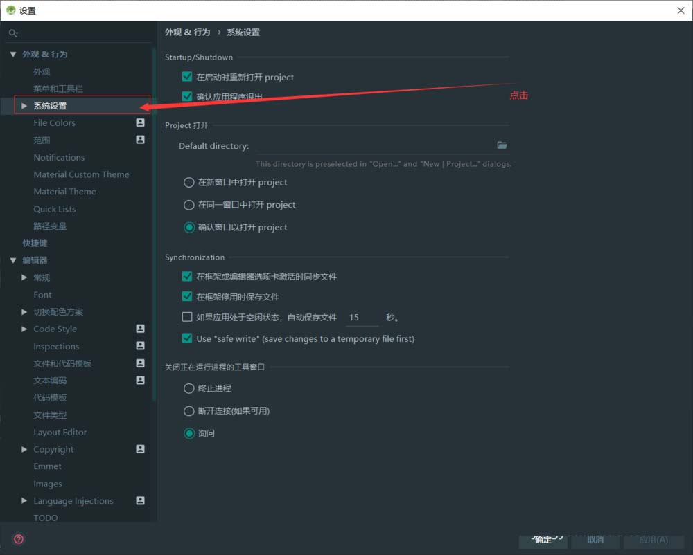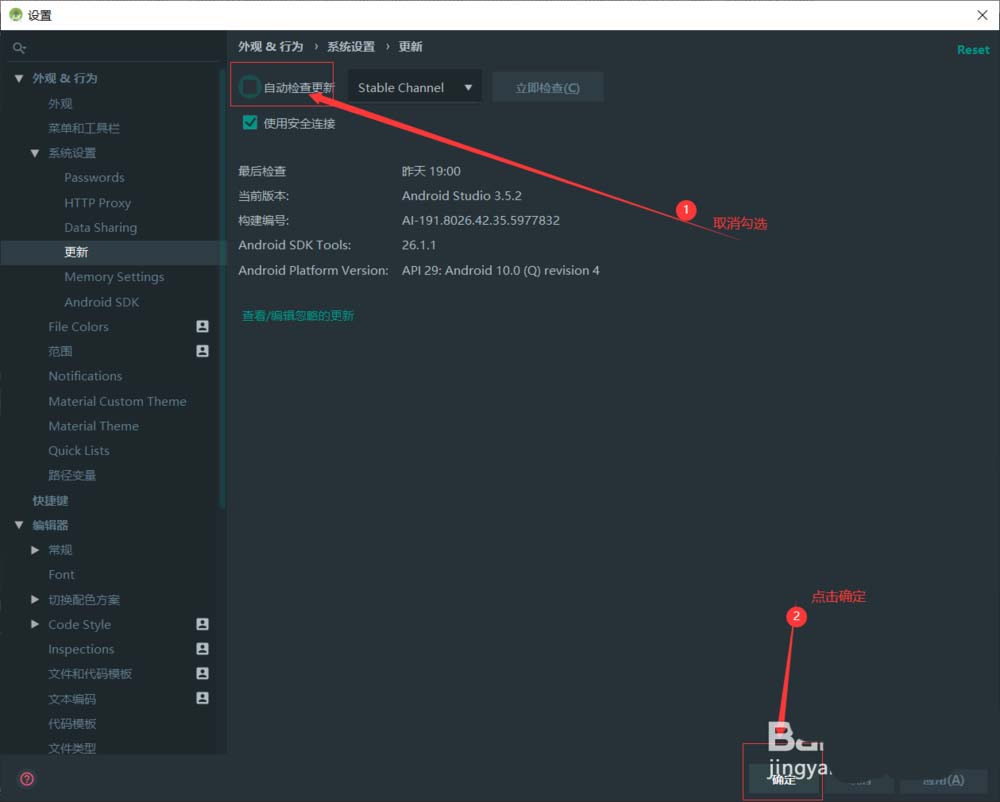 打開Android Studio。打開左上角“文件”-“設(shè)置”。點擊“外觀&行為”。點擊“系統(tǒng)設(shè)置”。點擊“更新”。取消勾選“自動檢查更新”,點擊確定。