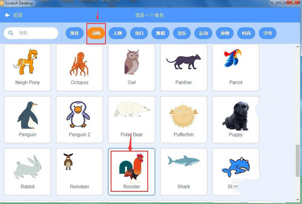 4、進(jìn)入scratch3.0的選擇一個角色頁面,在動物類別中點(diǎn)擊選中大公雞;