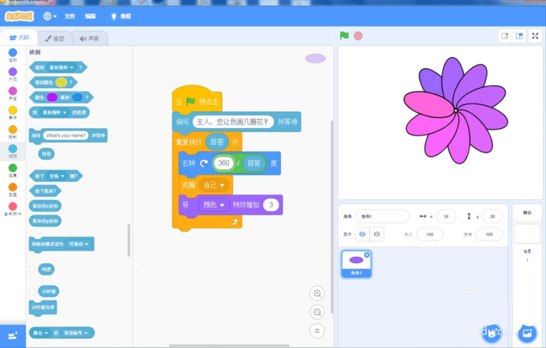 以上就是scratch3.0使用克隆命令控制旋轉花瓣數的教程,希望大家喜歡,請繼續關注武林網。