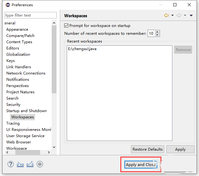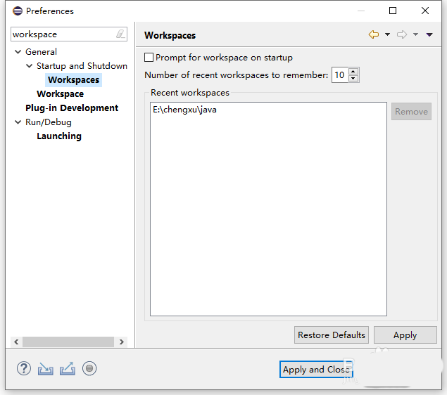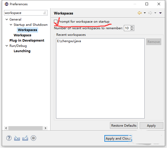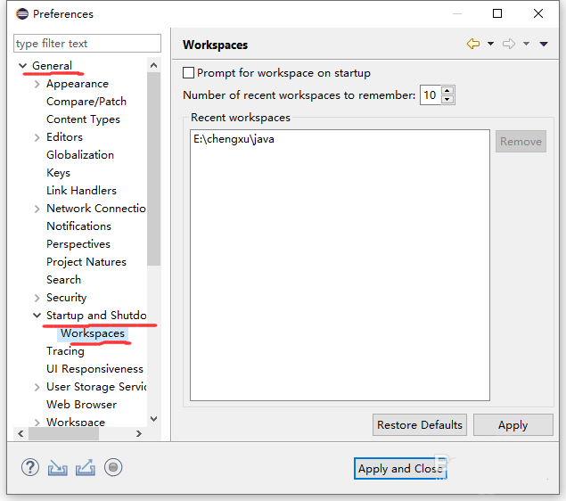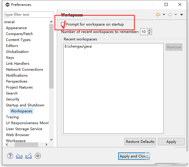 2、彈出對話框后,選擇General——Startup and Shutdown——Workspaces選項