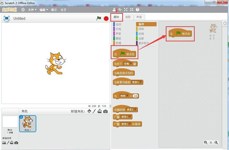 2、點擊腳本,先添加好當綠旗被點擊命令;