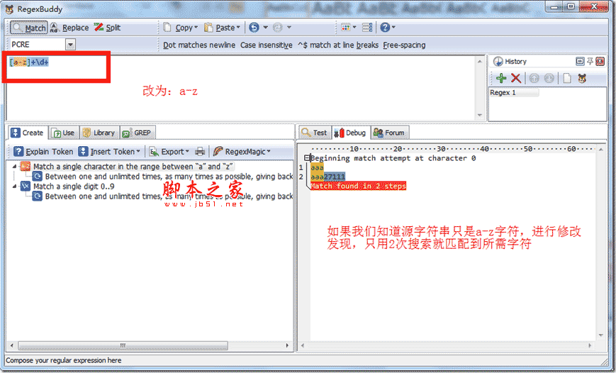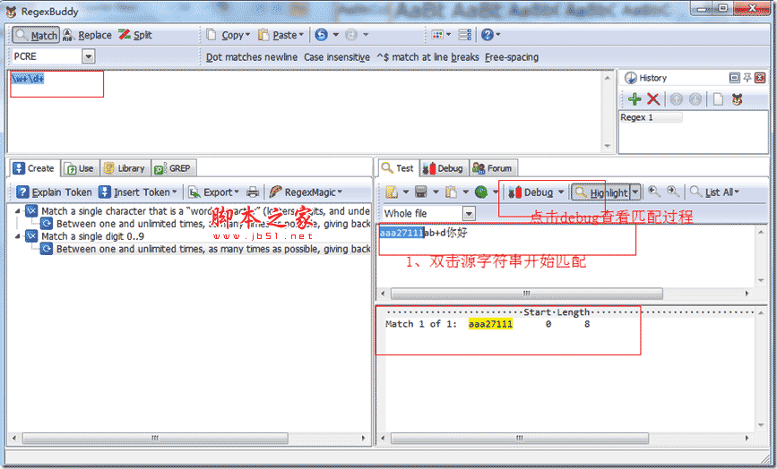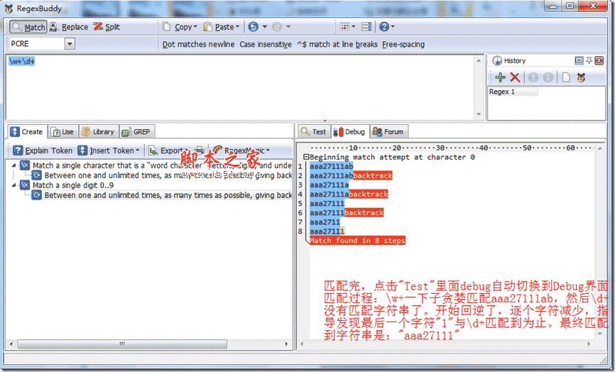 從上面過程中,我們發現,每次回溯,要重新操作匹配因此匹配搜索次數,直接影響正則表達式的性能。做正則表達式性能優化,一般就是優化查詢的次數。這個是我們分析過程,如果有個工具能夠實實在在看到每一步匹配過程,對于我們優化正則表達式將帶來太多方便了。這里介紹工具是:regexbuddy軟件,它就是一個實實在在看到匹配過程工具。