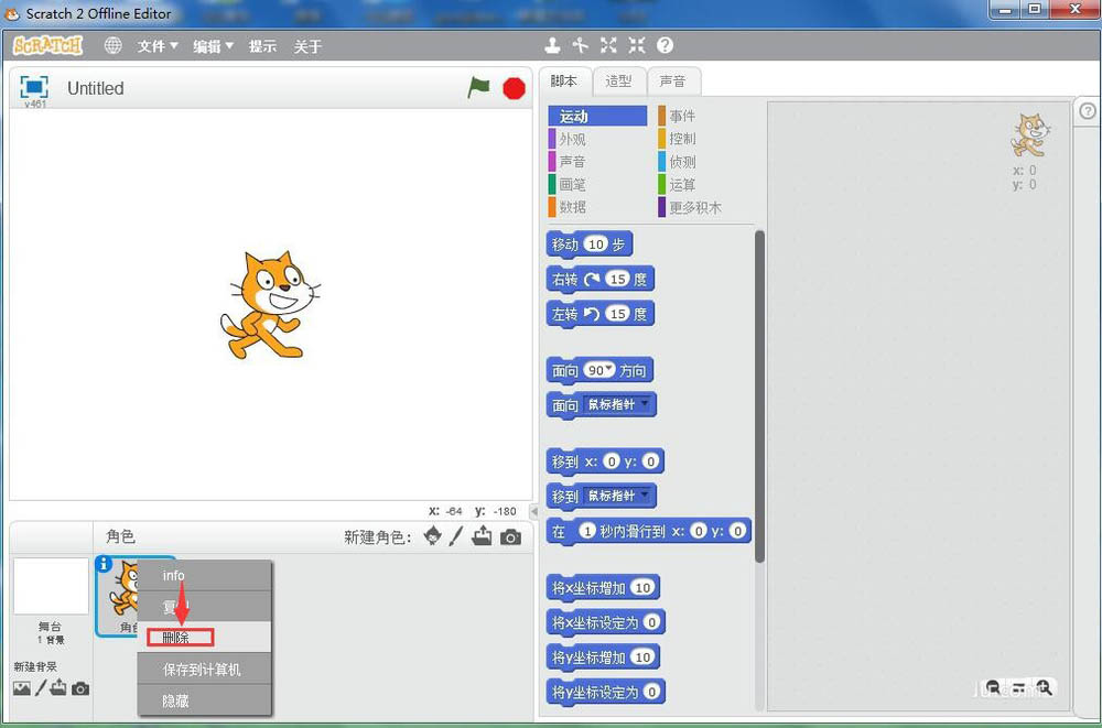 1、打開scratch2.0,將小貓刪除;