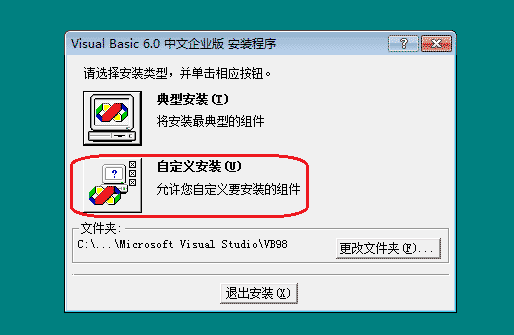 然后點擊“自定義安裝”,此處選擇自定義安裝的目的是為了取消安裝那個VSS組件,要不然選擇“典型安裝”后,會同時安裝了VSS組件,這樣以后每一次打開從其它地方拿來的系統源代碼時都會有一個英文提示,挺煩人的。