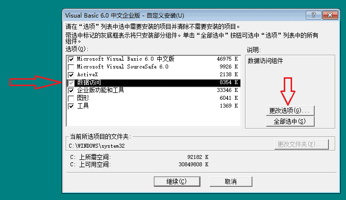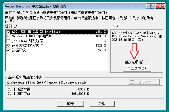 選中“數據訪問”那一項(不是去掉前面的鉤),然后點擊“更改選項”按鈕,如圖所示: