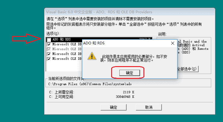 去掉“ADO 和 RDS”選項的鉤(很重要),此時會彈出一個對話框,點擊“確定”即可,如圖所示: