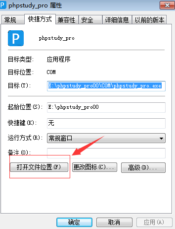 2.右擊phpstudy桌面圖標(biāo) - 屬性 - 打開(kāi)文件位置(如圖)(如:E:/phpstudy_pro00/COM/phpstudy_pro.exe )