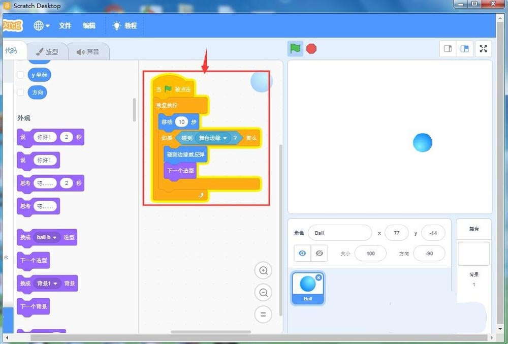 7、點擊綠旗執行程序,小球就開始循環運動,遇到邊緣就反彈變色。