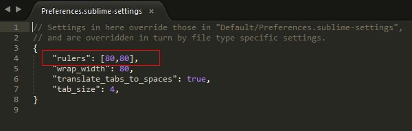 3、在彈出的文本編輯里增加"rulers": [80,80], 這一行 []里兩組數(shù)據(jù)代表豎線的起始和結(jié)束,可以自己調(diào)整。