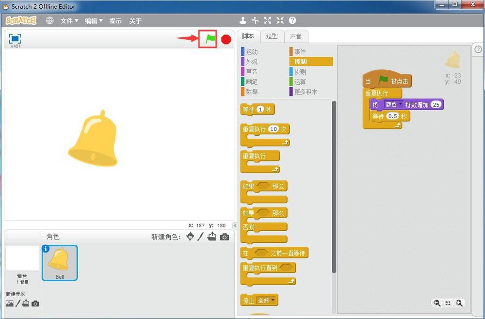 5、按綠旗執行程序,會變色的鈴鐺就創建好了。