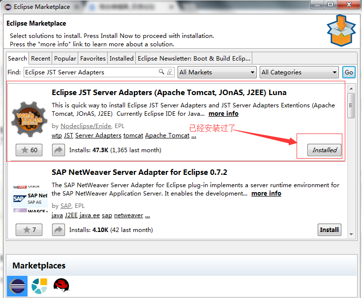 5、由于我已經(jīng)安裝好了,才會有"Installed"的按鈕,說明已經(jīng)初始安裝了,您第一次安裝會出現(xiàn)"Install"的按鈕。