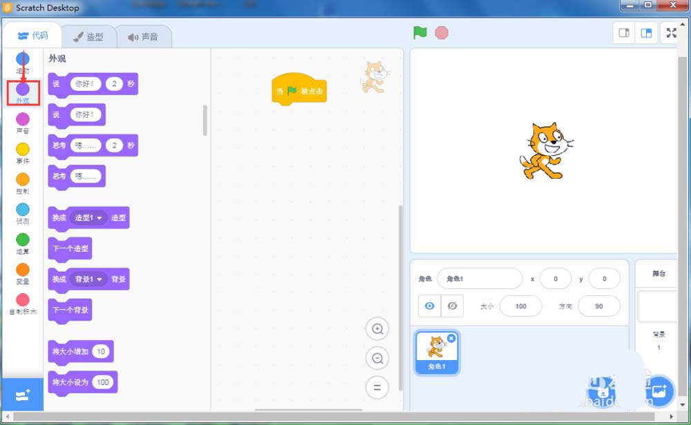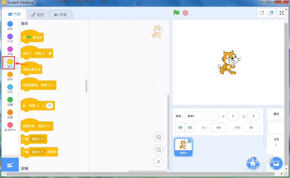 3、添加當(dāng)綠旗被點擊命令到腳本編輯區(qū)中;;