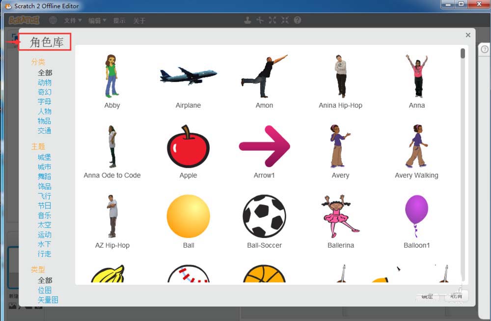 4、進入scratch2.0的角色庫,里面呈現出所有類別的角色;