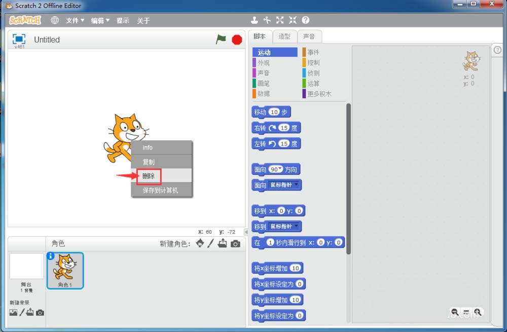 2、在角色小貓上按右鍵,點擊刪除,將小貓刪除掉;