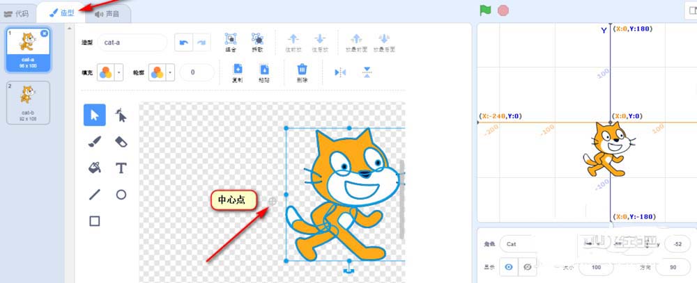 4、scratch一般都是使用圖片作為角色,一張圖片以哪個點為參照點來確定坐標呢?其實這個參照點可以查看,也可人為修改。